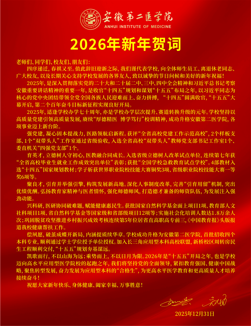版权所有 © 安徽第二医学院 地址:合肥市芙蓉路632号/芜湖路387号(230601) 电话:0551-63818254(传真) 招生热线:0551-62860000 皖ICP备:11004322号-1
