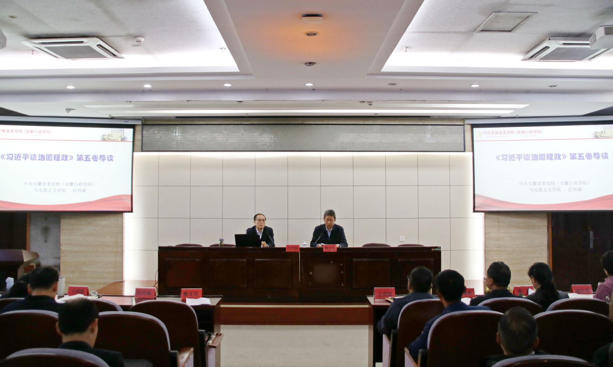 汪兴福教授以“深入学习《习近平谈治国理政》第五卷导读”为题,从充分认识第五卷出版的重大意义、体系化学理化把握第五卷要点主旨、深学笃行党的创新理论最新成果三个方面,进行了系统梳理、深入解读和精辟阐释。报告政治站位高、理论思考深、联系实际紧,脉络清晰、重点突出、深入浅出,兼具政治高度、理论深度、历史维度和实践厚度,富有思想冲击力和理论感染力,为与会人员全面、系统、深入地理解《习近平谈治国理政》第五卷提供了权威指导和深刻启发。