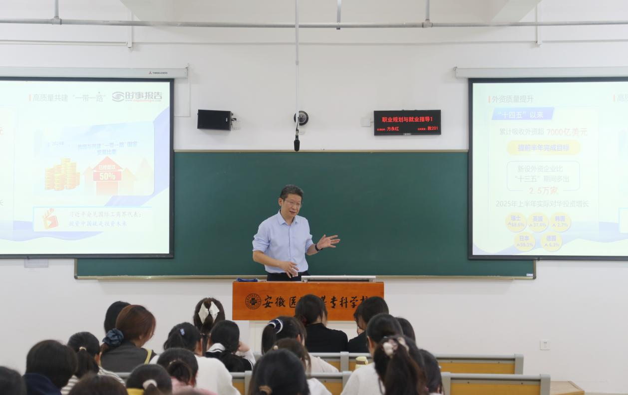 校党委书记姚文兵在《决胜“十四五”奋发向前行》专题授课中,从国家顶层设计到地方创新实践,系统解读了“十四五”规划的战略意图与实施路径。他结合医疗健康领域的鲜活案例,详细阐释了高质量发展的内涵与实践要求。在《纪念抗战胜利坚定民族信念》专题中,通过珍贵历史影像和生动口述史料,带领学生重温抗战岁月,深刻阐释了抗战精神的时代价值,勉励学子将个人理想追求融入中华民族伟大复兴的宏伟征程。
