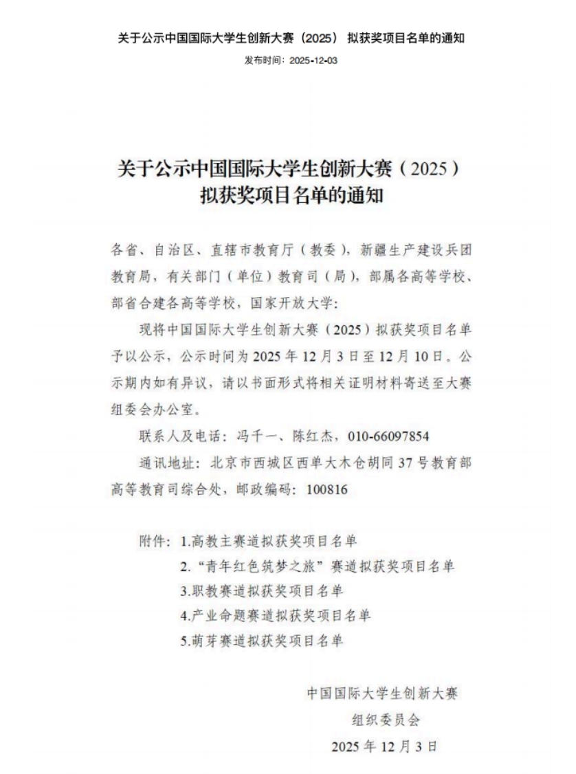 近日,由教育部等12个国家部委联合主办的中国国际大学生创新大赛(2025)全国总决赛在河南郑州圆满收官。我校两支参赛团队历经校赛、省赛、国赛三级严苛遴选,从全球150余个国家和地区的数万参赛项目中脱颖而出,通过国赛材料评审的严苛考验,分别斩获产业赛道与高教主赛道双铜奖。充分彰显了我校创新创业教育的扎实成效与学子们敢闯会创的青春风采。