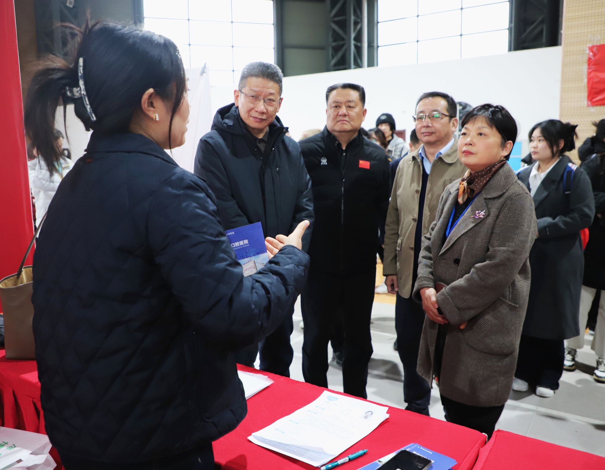 12月12日,我校举办“人才兴皖 ‘就’在江淮”2026届毕业生冬季校园招聘会。合肥市公共就业人才服务管理中心主任曹静、合肥市公共就业人才服务管理中心副主任梁海江到场出席指导。我校党委书记姚文兵,校领导王劲松一行陪同并与用人单位深入交流。姚文兵指出,我校始终将毕业生就业工作作为立德树人和服务社会的重要环节,学校将在办好招聘会的同时,以“访企拓岗”行动为牵引,深化与重点行业、重点单位的战略合作,推动人才培养供给侧结构性改革,为“人才兴皖”战略和江淮大地医疗卫生事业的高质量发展持续注入青春动能。