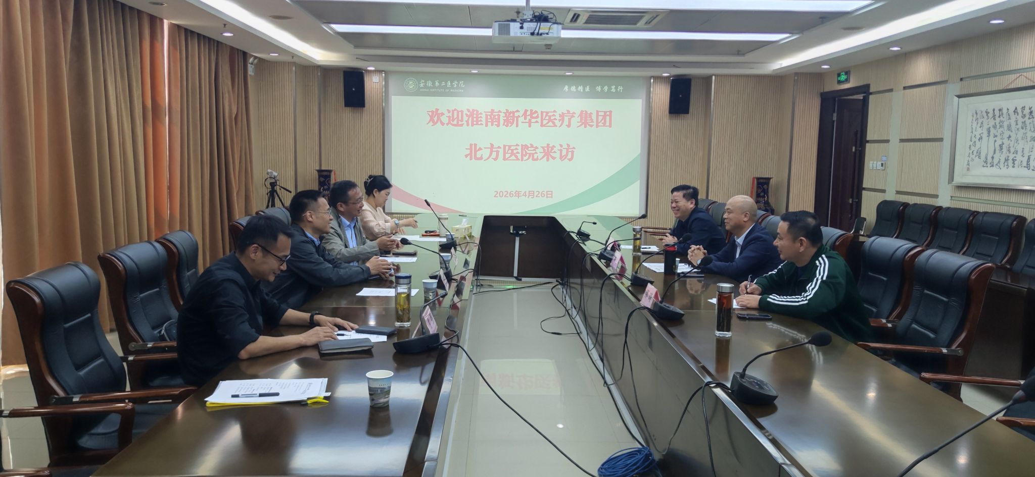 为深入贯彻落实教育部、省教育厅“访企拓岗促就业”专项行动部署,进一步深化产教融合与校企合作,推动人才培养与企业需求精准对接,4月26日上午,淮南新华医疗集团北方医院党委副书记、纪委书记鲍国一行来校交流。校党委委员、副院长吴文涌,校领导王劲松出席会议并座谈,会议由王劲松主持。学生处、临床医学院相关负责人参加座谈交流。