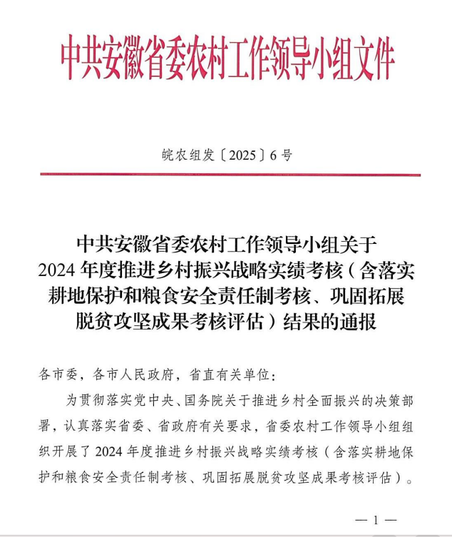 近日,中共安徽省委农村工作领导小组通报2024年度推进乡村振兴战略实绩考核结果,我校定点帮扶金寨县关庙乡大埠口村工作被评定为“优秀”等次(省直高职高专第2名),这也是我校在考核中连续五年位居前三。