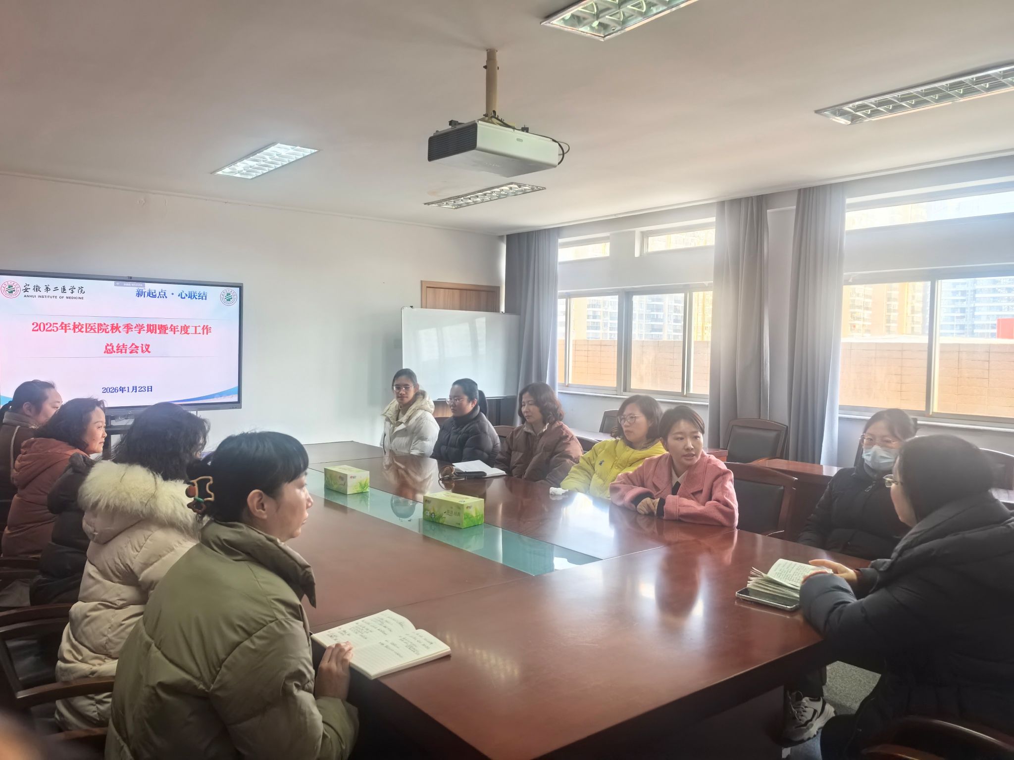 2026年1月23日下午,校医院在芙蓉路附属口腔医院四楼会议室召开2025年度工作总结会暨寒假工作协调会。会议全面回顾了本年度工作情况,并就寒假期间芙蓉路校区与新桥校区综合门诊部的安全管理、设备维护、值班安排及药品保管等保障工作进行了共同研究与协调。会议由校医院院长周卫凤主持,校医院全体职工参加。